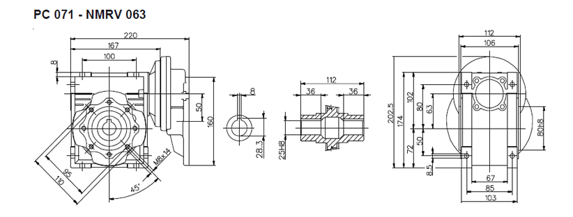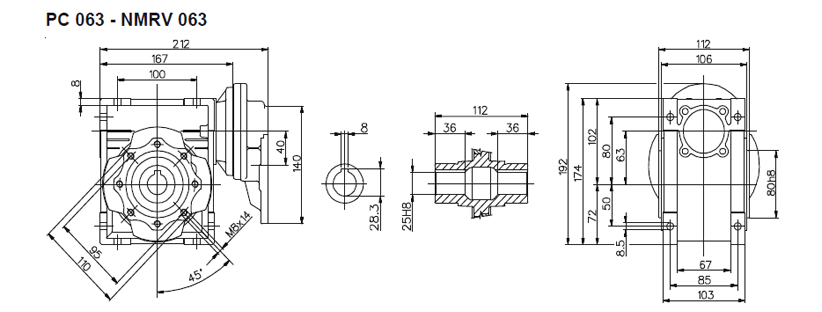 Цилиндро-червячный мотор-редуктор серии PCRV состоит из червячного редуктора NMRV и цилиндрической ступени PC. В отличии от редукторов NMRV цилиндрическая ступень имеет только одно значение передаточного отношения (3,5). Ступень PC поставляется в четырех типоразмерах: PC 63, PC71, PC80, PC90. Ступень устанавливается между электродвигателем и редуктором и позволяет получить диапазон передаточных чисел 75 – 320. Корпус из алюминиевого сплава. Шестерни выполнены из закаленного сплава 20MnCr5 (UNI7846).